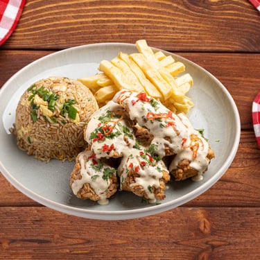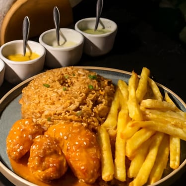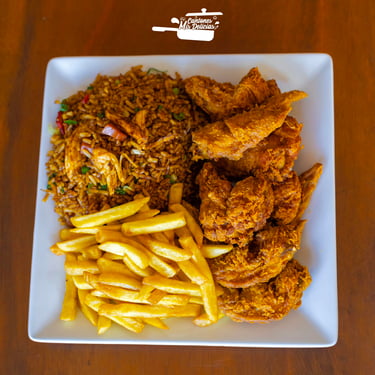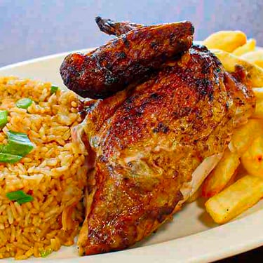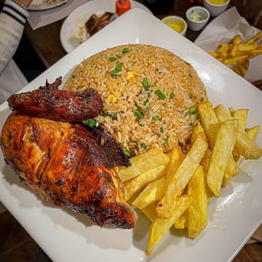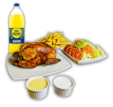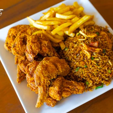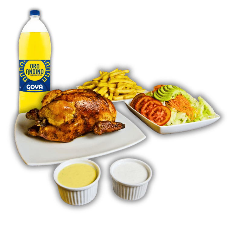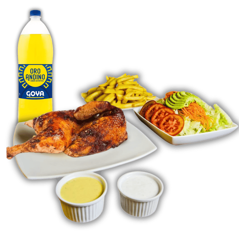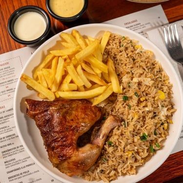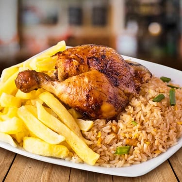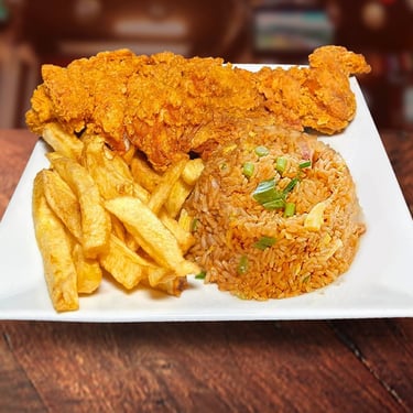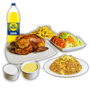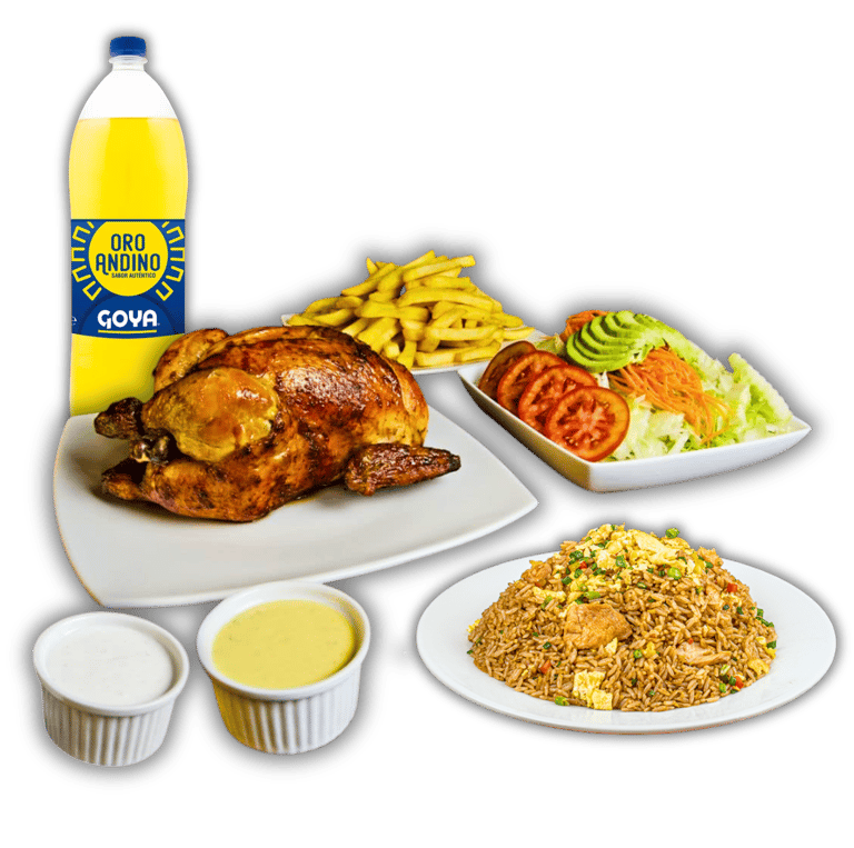 Jugoso pollo broaster acompañado de arroz chaufa, papas fritas doradas y una gaseosa. Una combinación irresistible de sabores peruanos en un solo plato.