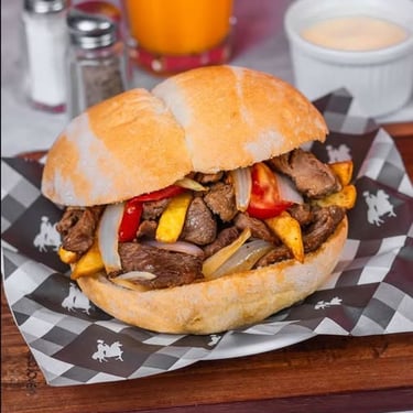Jugoso lomo saltado servido en pan crujiente. Fusión criolla irresistible.