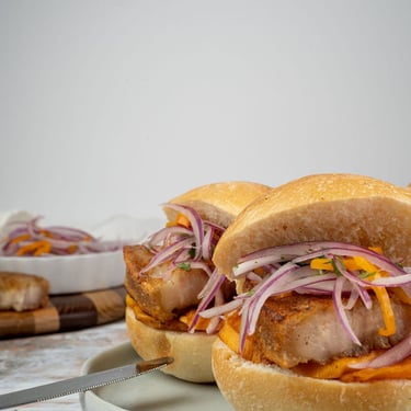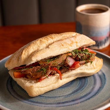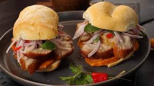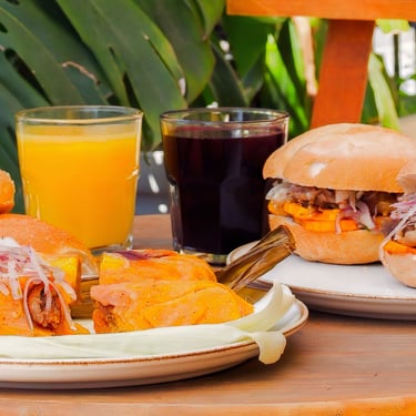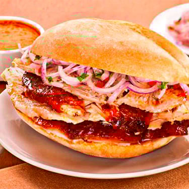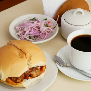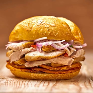 Chicharrón de cerdo crujiente, camote frito y salsa criolla fresca, servidos en pan artesanal. Un clásico peruano lleno de sabor.