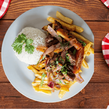 Carne salteada con cebolla, tomate y sillao, servido con papas fritas y arroz. Sabor peruano auténtico.