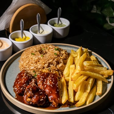 Alitas Broaster sazonadas en salsa BBQ, acompañadas de arroz chaufa, papas fritas y una gaseosa.